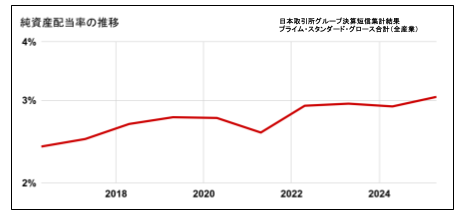 以下は日本取引所グループ決算短信集計結果(プライム・スタンダード・グロース合計 全産業)の直近10年間の純資産配当率の推移ですが、徐々に水準が切り上がっており、2025年3月期では3.05%となっています。