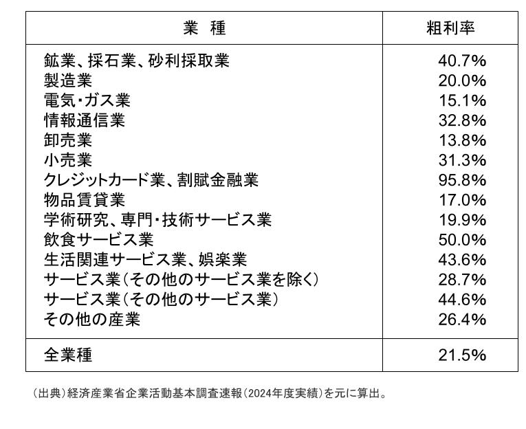 粗利率の水準は、業種によって大きく異なります。