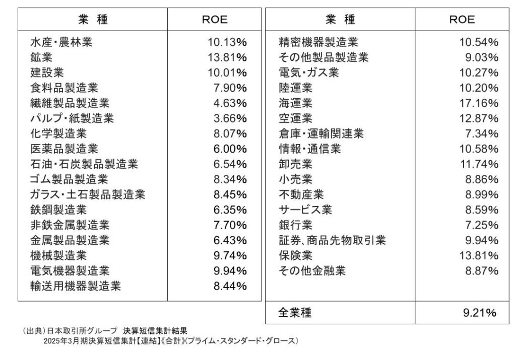 ROEの水準は業種によって異なりますが、