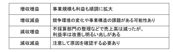 売上高の増減、利益の増減といった業績推移のパターンから、以下のようなことが推察できます。